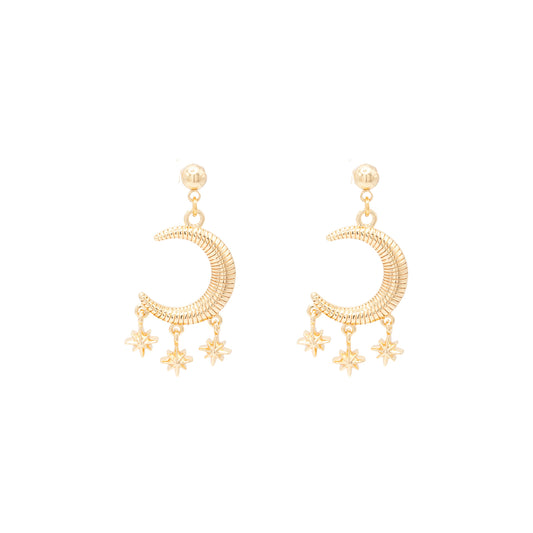 14k Gold Crescent Moon Star Ball Post Dangle Earring Celestial