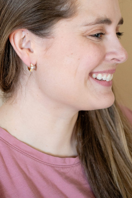 14k Gold Pearl Cubic Zirconia Huggie Hoop Earring