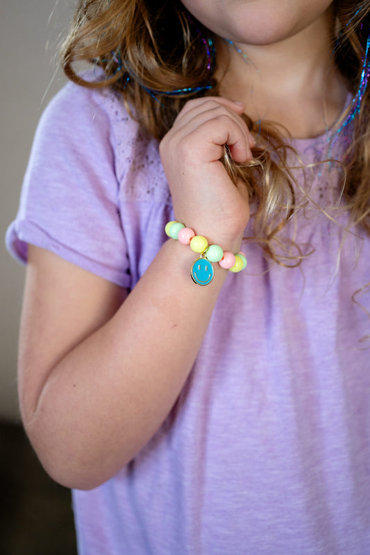 Children’s Beaded Stretch Bracelet with Enamel Blue Happy Face Charm – Designed Specifically for Kids’ Wrists