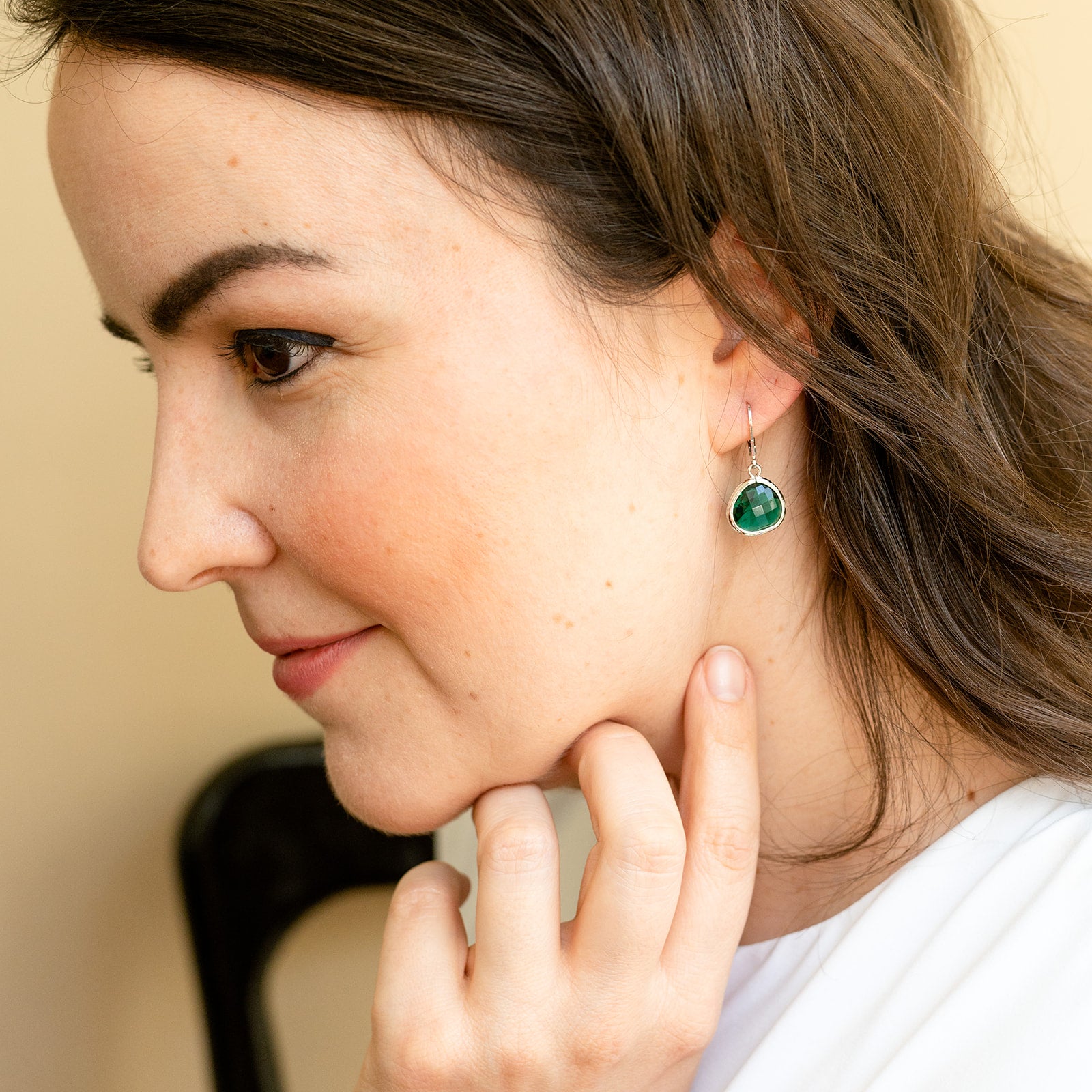 Design: Each earring showcases a 13mm x 16mm faceted glass gemstone, elegantly framed and suspended from a secure leverback closure.