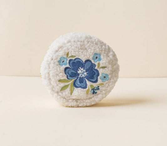 SALE Circle Teddy Pouch – Cozy Sherpa Fabric Cosmetic Bag with Wipeable Interior Lining and Gold Hardware