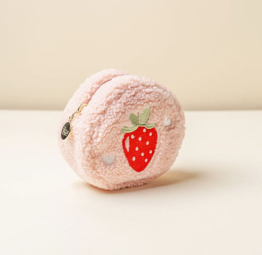 SALE Strawberry Teddy Circle Zipper Pouch Cozy Sherpa Fabric Cosmetic Bags with Gold Hardware and Wipeable Interior Lining