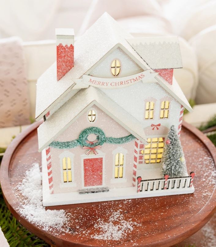 Crafted from durable heavyweight paperboard, this holiday house includes a battery-powered interior light with an 8-hour timer for effortless, glowing ambiance. Its whimsical design captures the spirit of the season, making it ideal for family gatherings, parties, or as a collectible addition to your Christmas village.